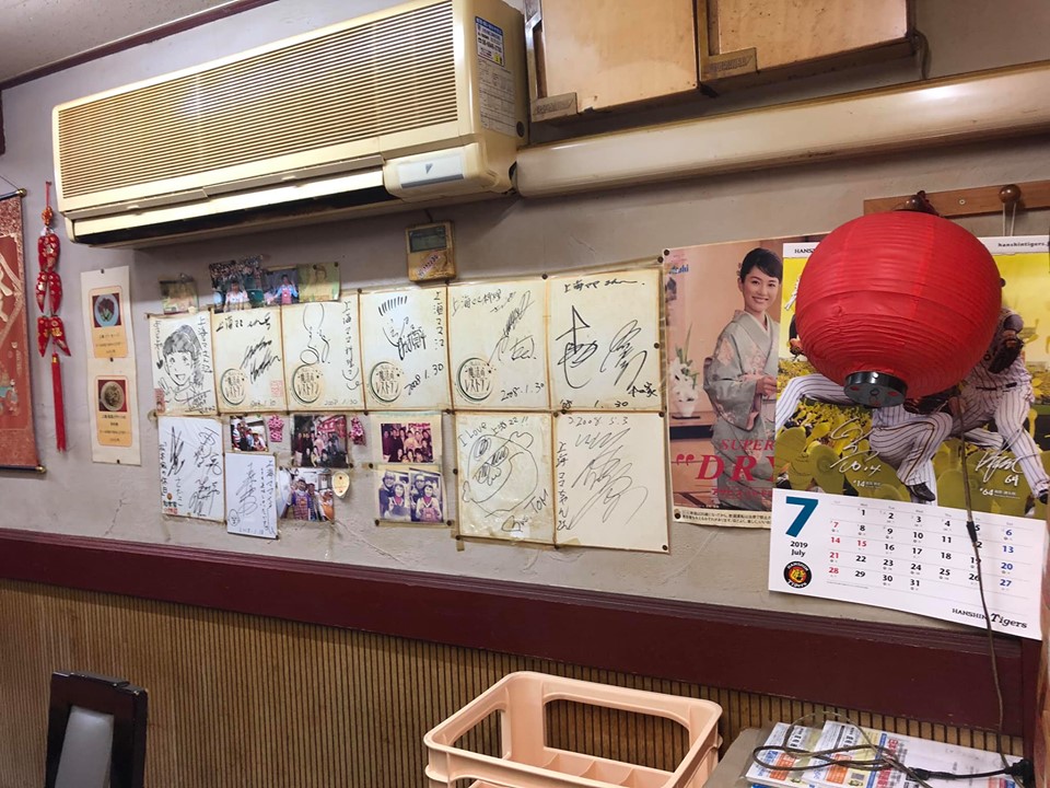 お店の中に入ると、カウンター席しかありませんが、店内にはいろいろな有名人のサインがたくさん並んでおり、有名人の間でも知られているお店のようです。調理師のママは お店の名前にもなっている通り、 上海出身ですが、かなりの阪神ファンらしいです。