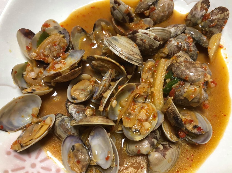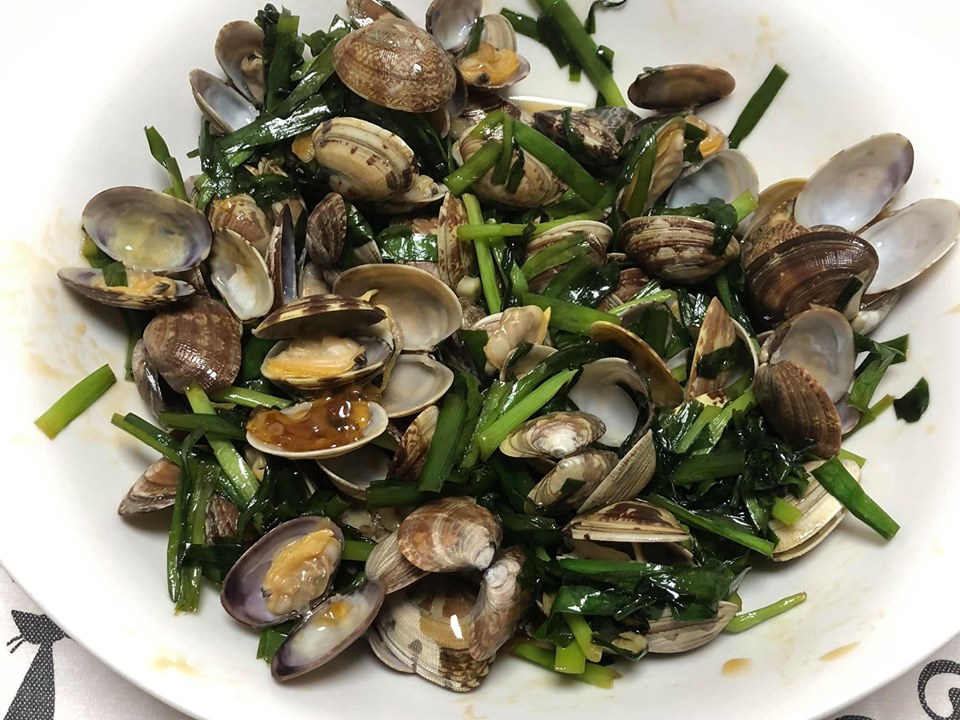 中華風ということでニラやねぎと合わせてオイスターソースで炒めました。味付けはニンニクがベースで、それに唐辛子を入れて出来上が入れた「辛酸っぱい味」が、貝類にはよく合います。