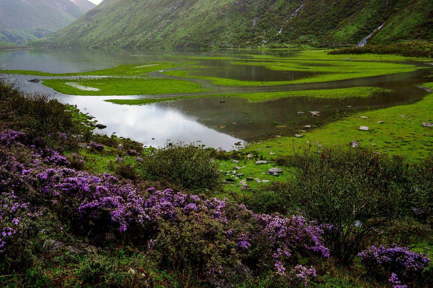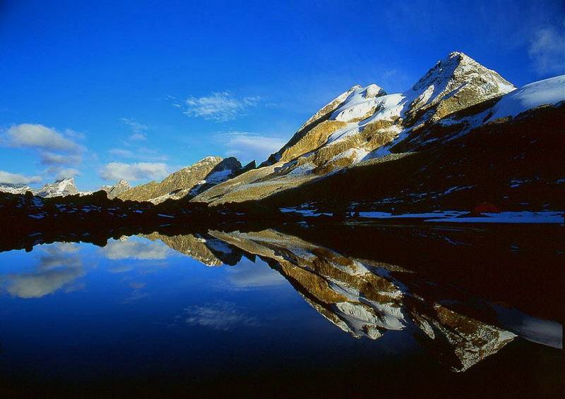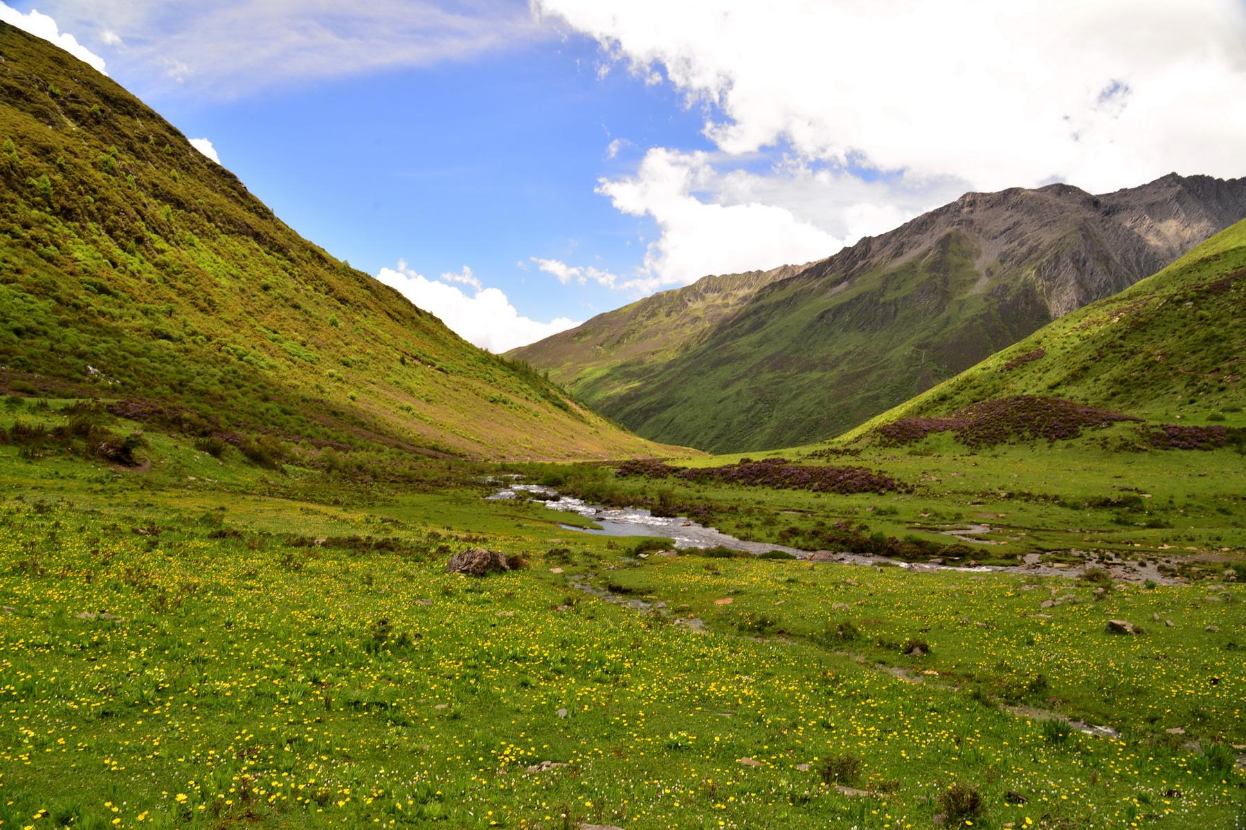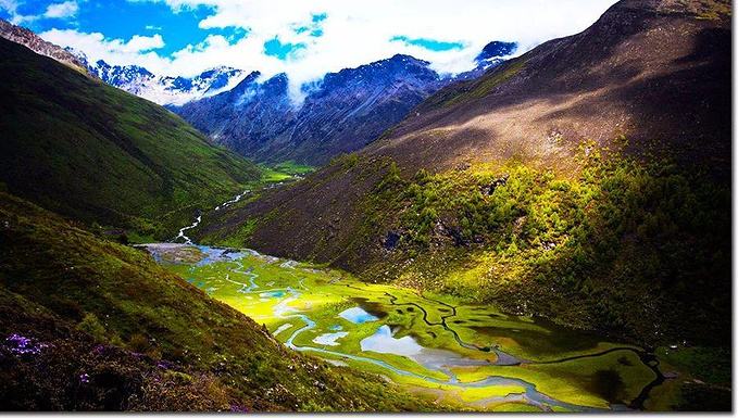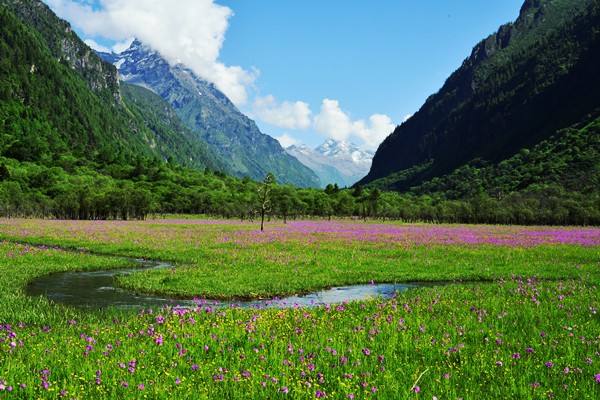 これらの山々はいずれも高山植物の宝庫であり、幻の花といわれるブルーポピーをはじめ、さまざまな希少な花が咲き乱れています。特に山の麓には長坪溝や、双橋溝や海子溝では高山植物のお花畑が堪能できます。海子溝には10数個の高山湖があり、 軽い風が吹いてくると、湖面上の波がまるで真珠のように波たちます。青空と白い雲の影が美しく湖面に映しだされ、周りの山峰もまるで湖面上で静かに眠っているかのようです。