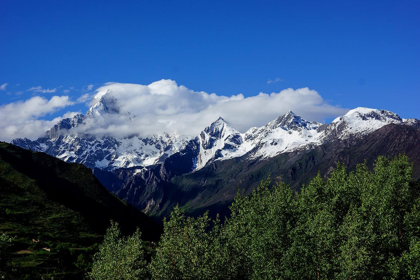四人姉妹とは、長女の大姑娘山(標高5335m)、次女の二姑娘山(標高5454m)、三女の三姑娘山(標高5664m)、末娘の四姑娘山(標高一番背が高くて6250m)のことを指します。たくさんの自然風景を楽しめ、中国のアルプスと呼ばれています。