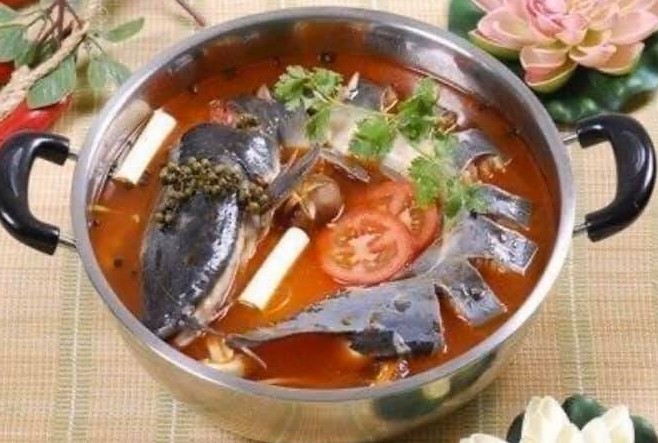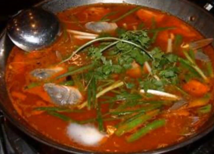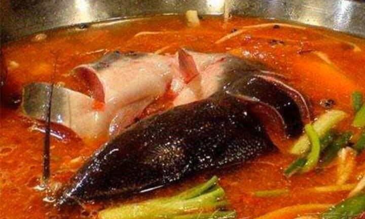(酸湯魚。酸っぱさの中に辛さがあり、新鮮な味がしており食欲をそそる一品です。スーラータンは当地の特産唐辛子と栄養が豊富な薬草と漢方薬を使い、もやし、筍、玉ねぎなどを入れ、特別な風味を出しています。スープが出来上がってから、魚を入れ煮込み、柔らかい魚が味付けたら出来上がりです。トマトを発酵させた紅酸を使ってます。トマトと唐辛子を混ぜたスープを使ってます。貴州省東南部は塩のとれない地域だったことから、風味を増すために“酸”が作られたとされ、乳酸発酵から生まれる爽やかな酸味が特徴です。)