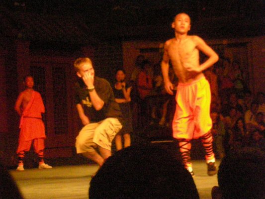 少林寺武術体験。ついていけず、観客の笑いを誘う。