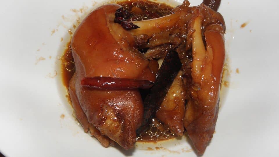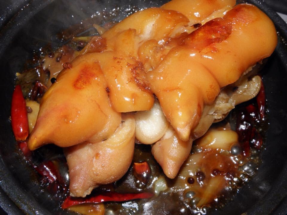 豚足1個、鷹の爪辣椒5個、花椒 15粒、氷砂糖6粒、八角1個、長ネギ5片、姜5片、醤油大さじ2杯、料理酒大さじ2杯、塩5グラム