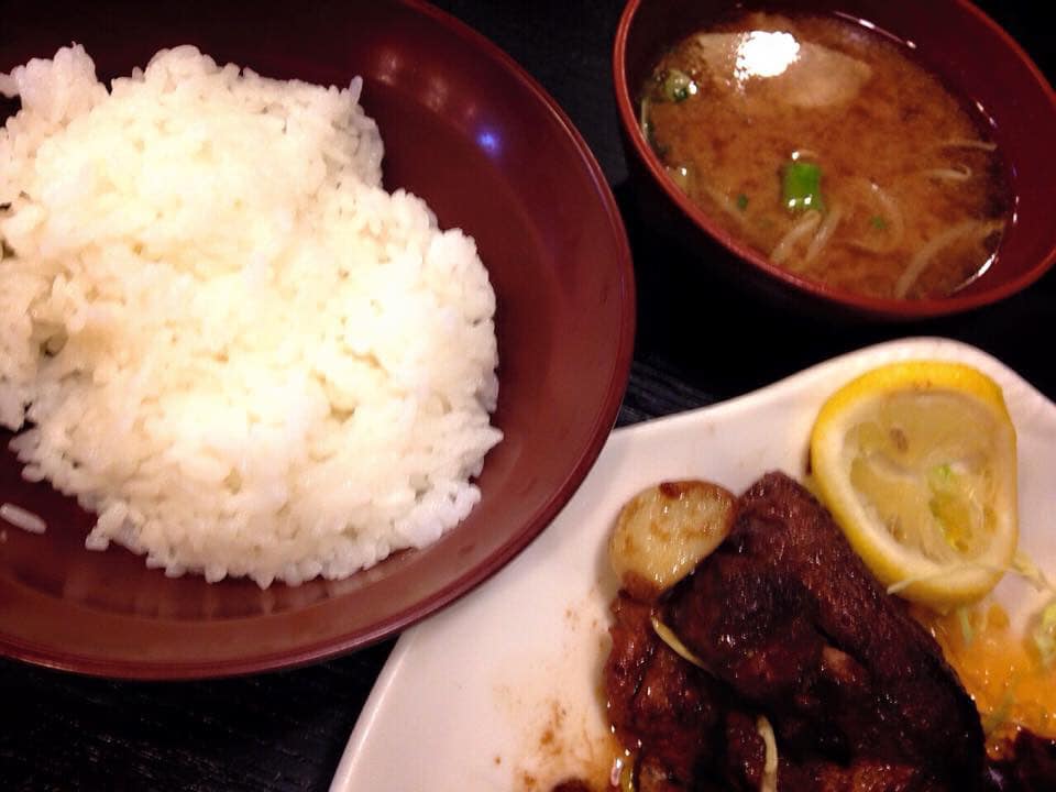 夕方5時に到着するも、店内は既にほぼ満席。すごい人気です!早速「大トンテキ定食」を注文?? しばらく待っていると、、、キターッ!大トンテキ!ポークステーキに丸ごとニンニク焼き^ ^。250gのトンテキは、見た目以上に厚く、食べ応えがあります。甘い脂に濃いタレが掛かり、ご飯がドンドン進みます!このタレを吸ったキャベツがまた美味い。豚汁も味濃い目。全体的に濃い味付けですね。