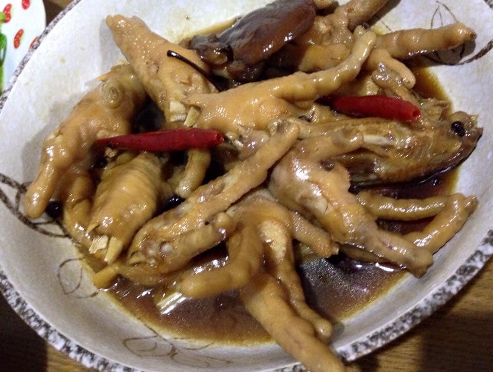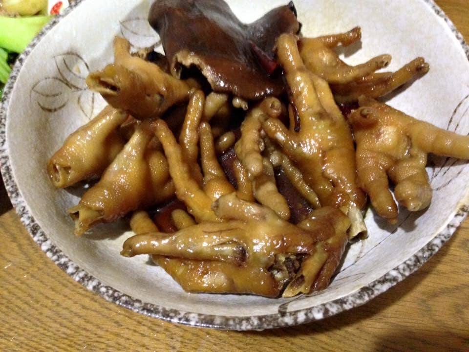 鶏足200グラム、八角2粒、シナモン1切れ、香葉2枚、乾燥辣椒 、生姜、 ニンニク、冰糖 、醤油、鶏がらスープの素、葱、椎茸、料理酒
