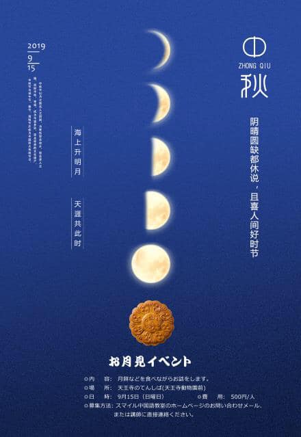 スマイル中国語教室では中秋の名月の時、月見大会を開催させていただきます。奮ってご参加ください。