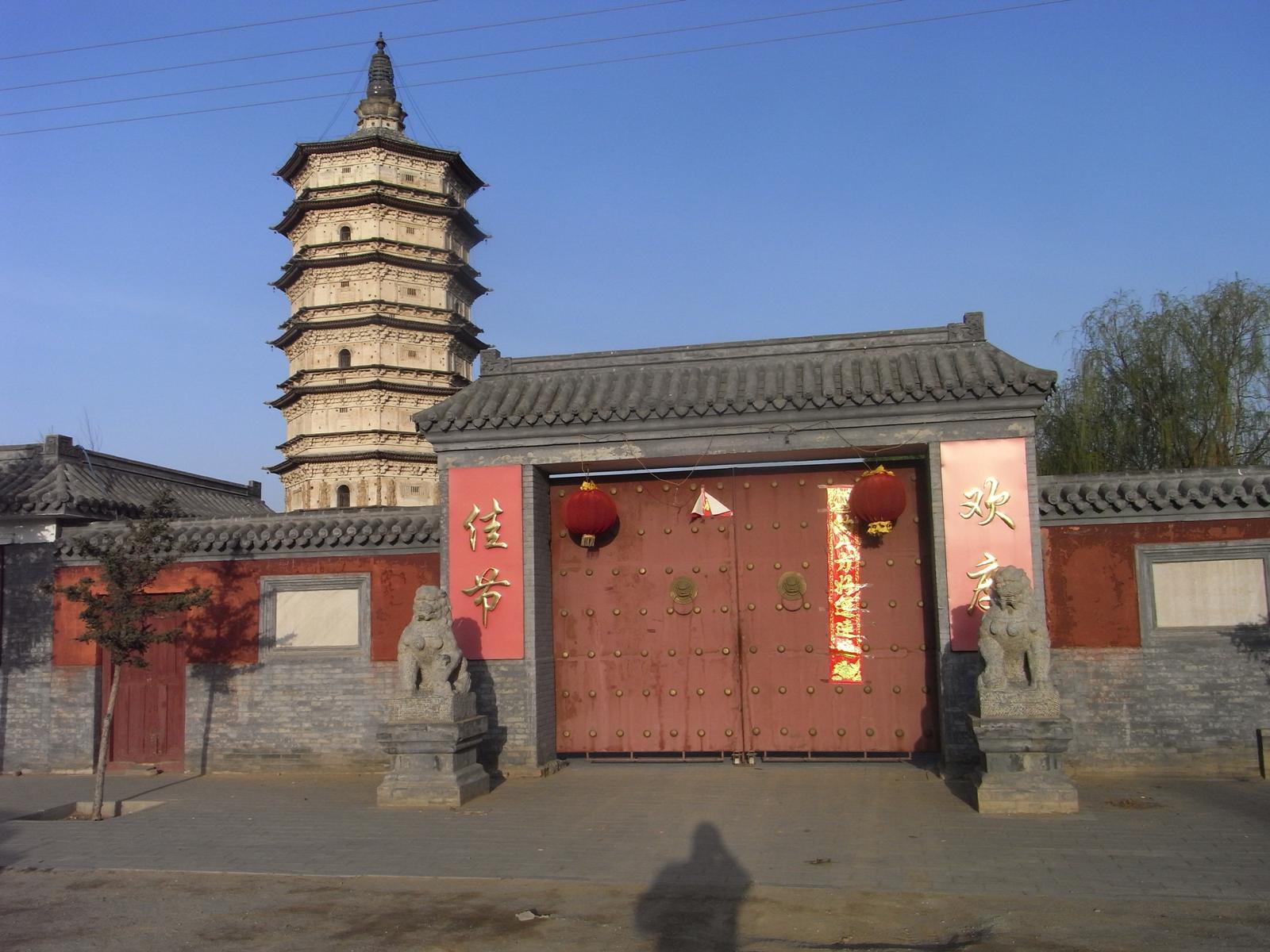 (万部華厳経塔の正門。900年ほど前、遼の時代に建てられた高さ55mの白塔が見えます。)