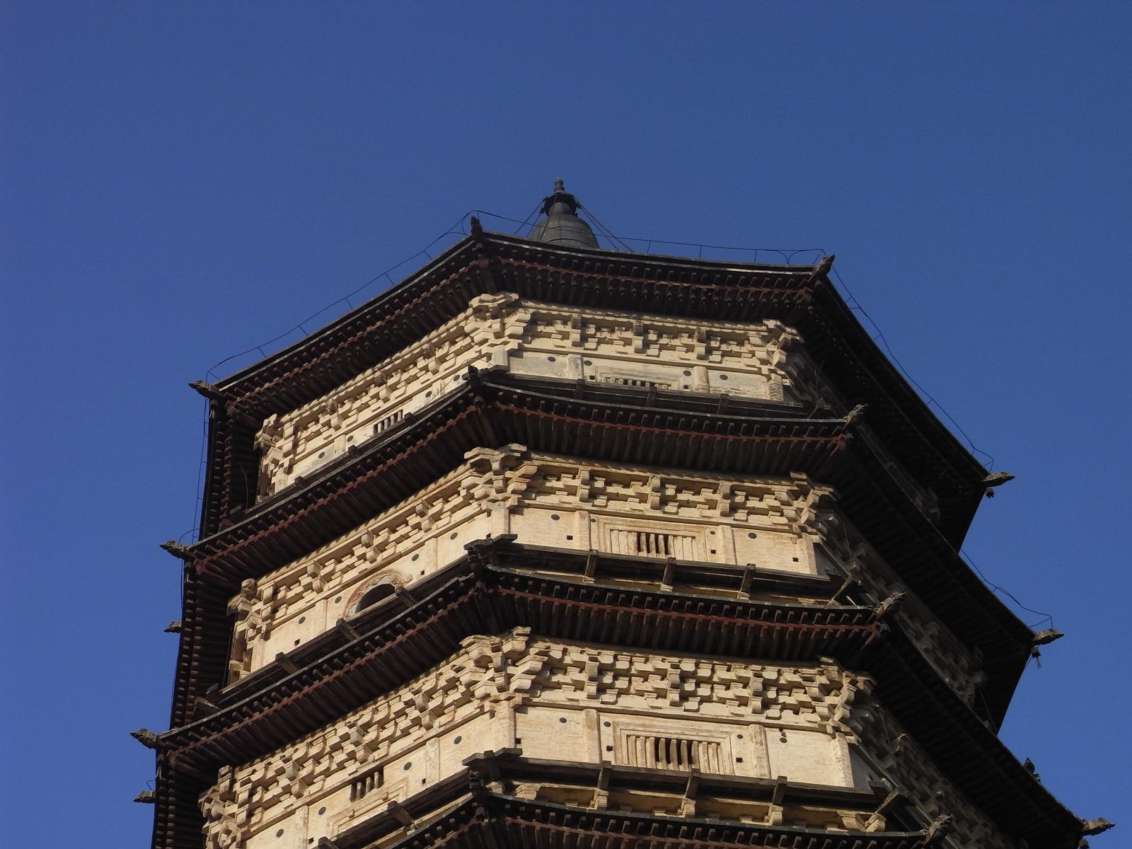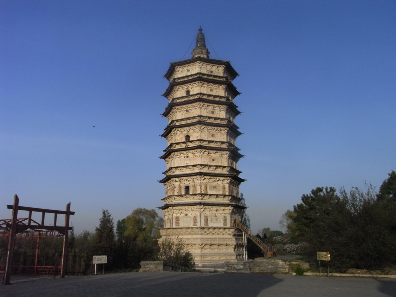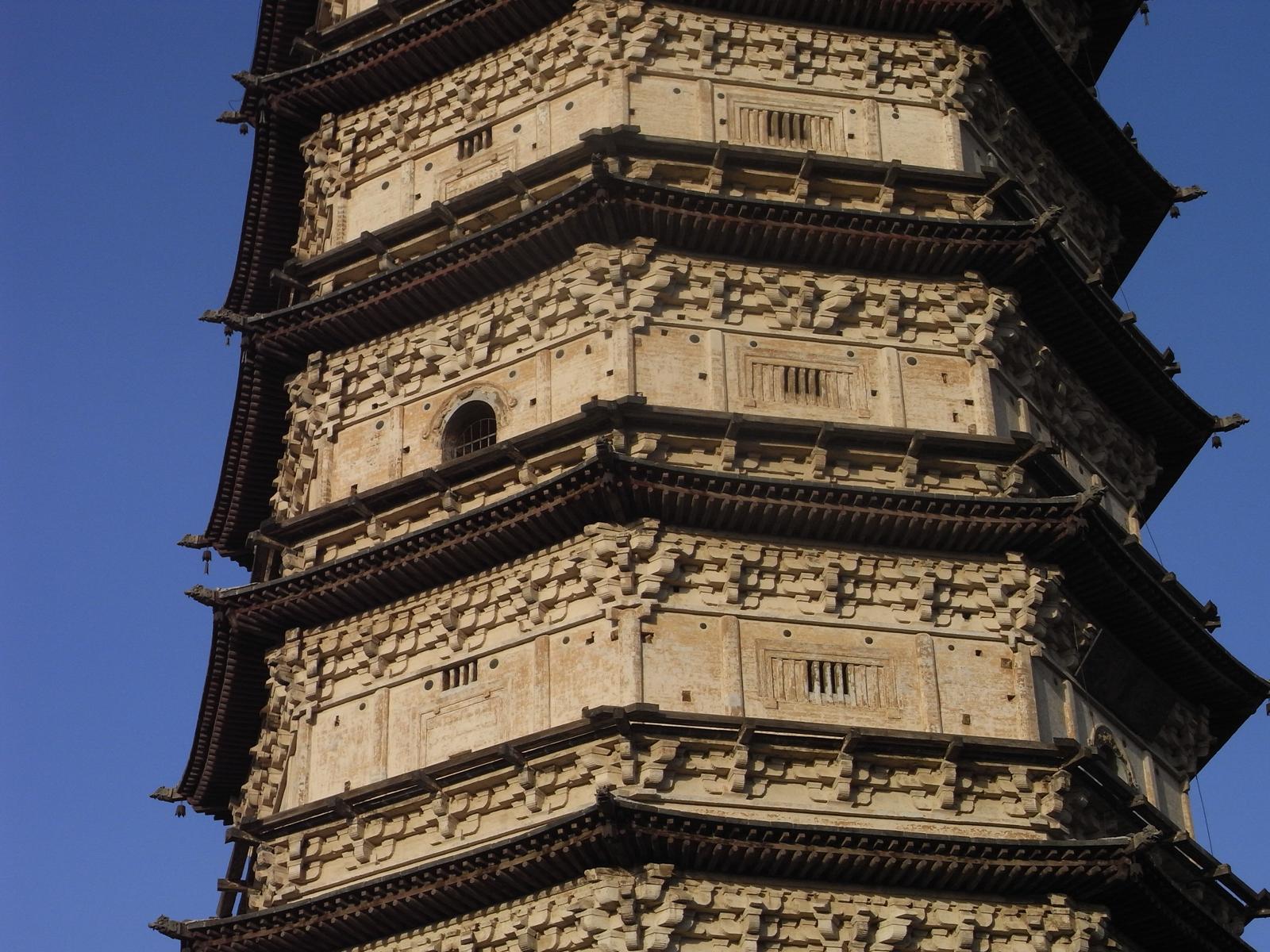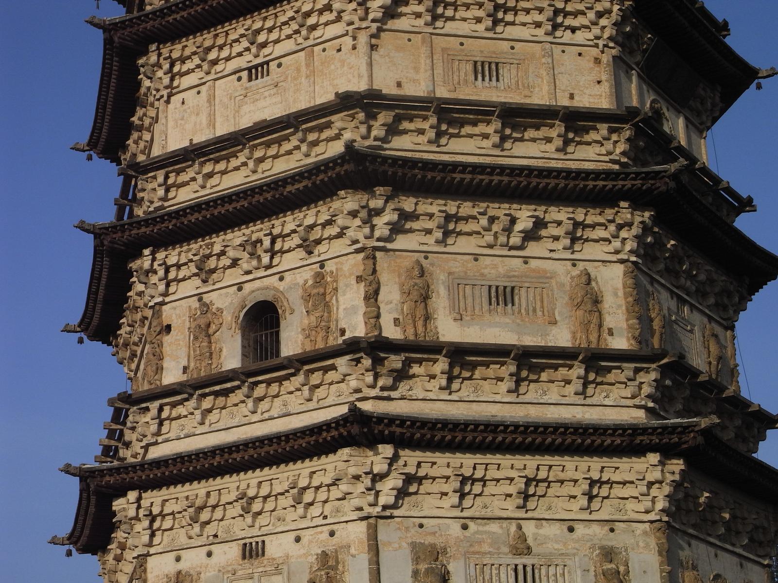 (遼の聖宗の時代(971〜1031年)の創建で、代々改修を行う。八角七層・楼閣式のレンガと木材でできた塔で、高さ43m。基壇の上部は仰蓮弁に積み上げ、第一・二層の外壁に釈迦・菩薩・四天王・力士の像をはめこむ。いずれも造形が優美で精彩に富み、線の流れがきわめて流暢で、芸術性が極めて高い。)