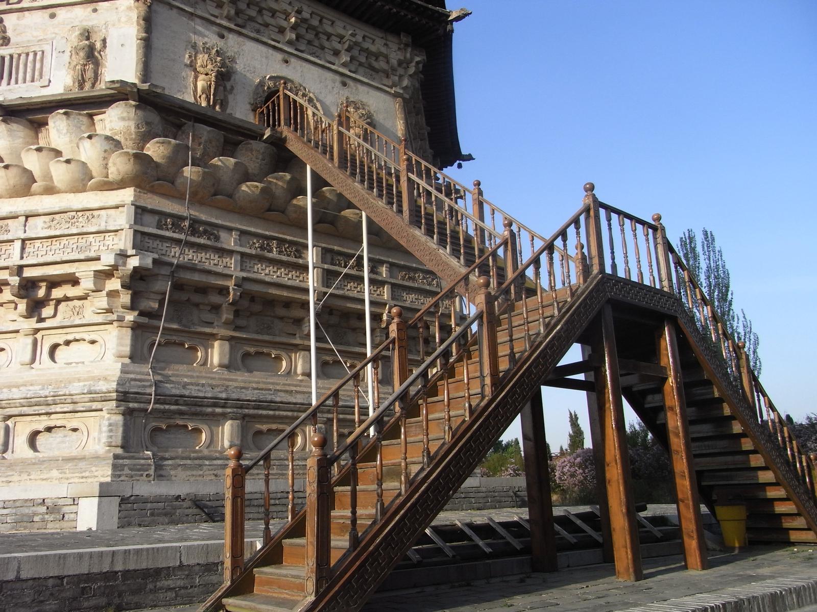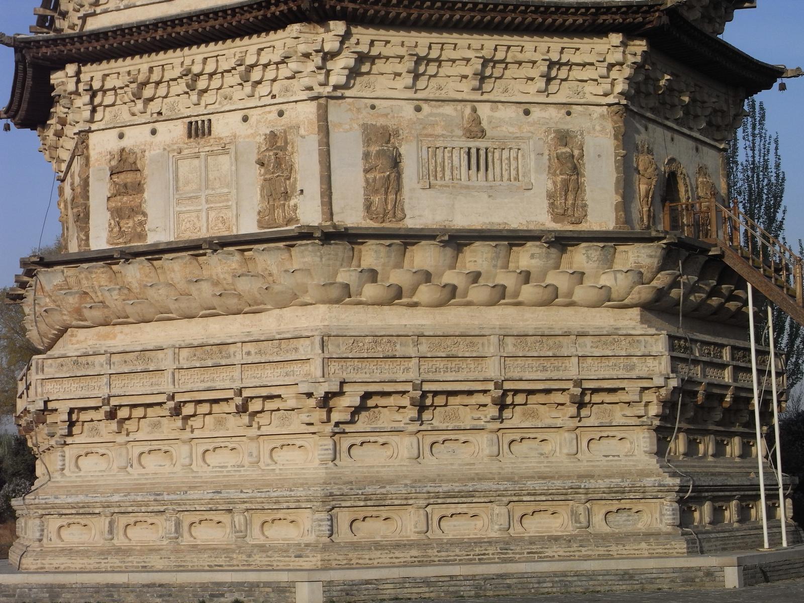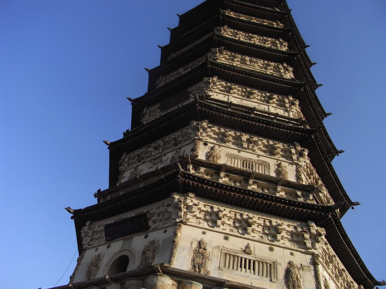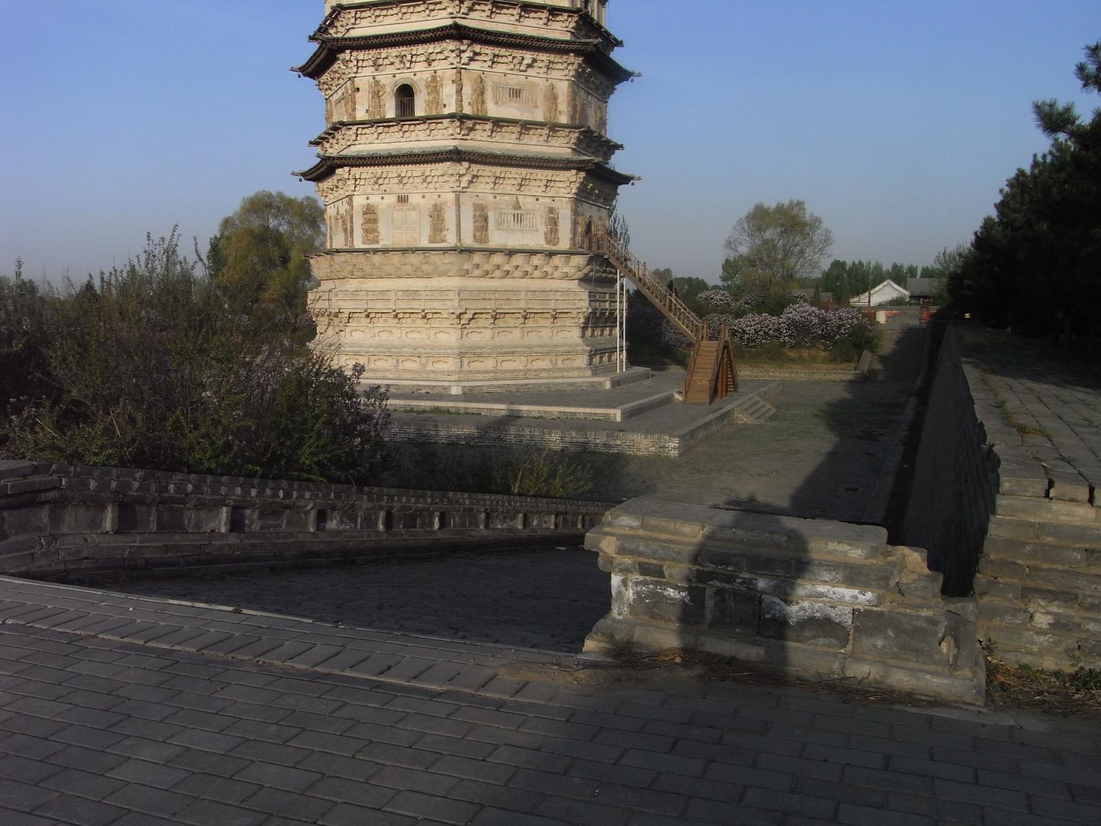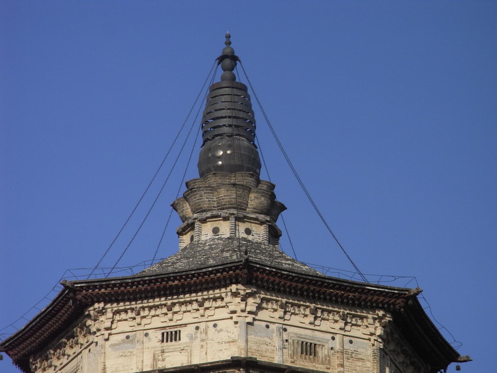 (遼の聖宗の時代(971〜1031年)の創建で、代々改修を行う。八角七層・楼閣式のレンガと木材でできた塔で、高さ43m。基壇の上部は仰蓮弁に積み上げ、第一・二層の外壁に釈迦・菩薩・四天王・力士の像をはめこむ。いずれも造形が優美で精彩に富み、線の流れがきわめて流暢で、芸術性が極めて高い。)
