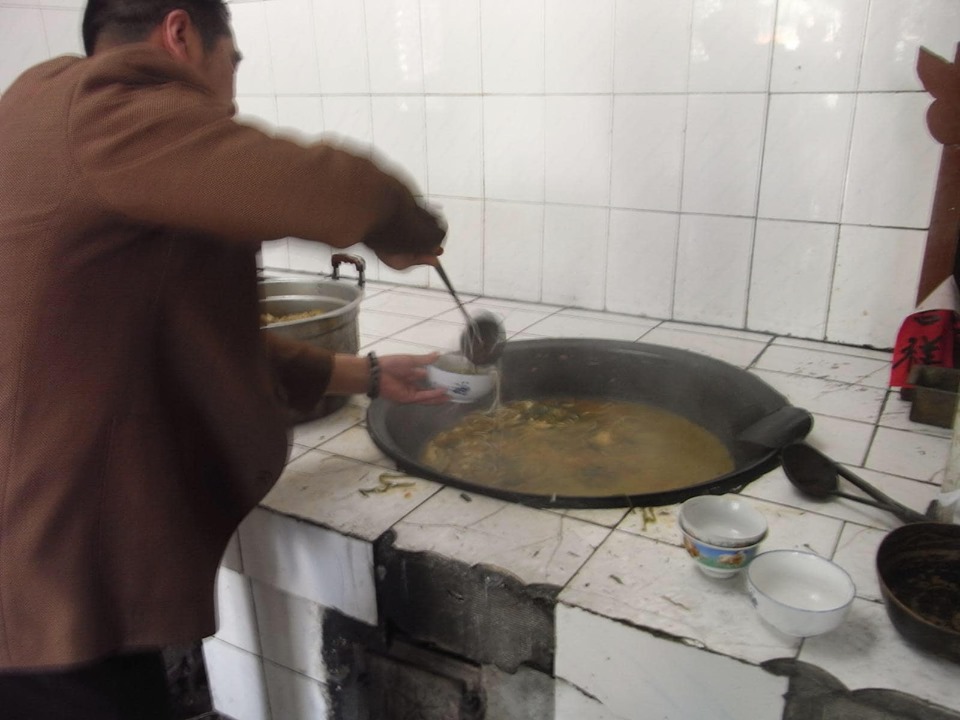 (寺院の中の食堂。粉?豆腐?をいただきます。春雨と豆腐片の入った美味しいスープです。)